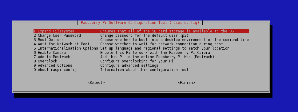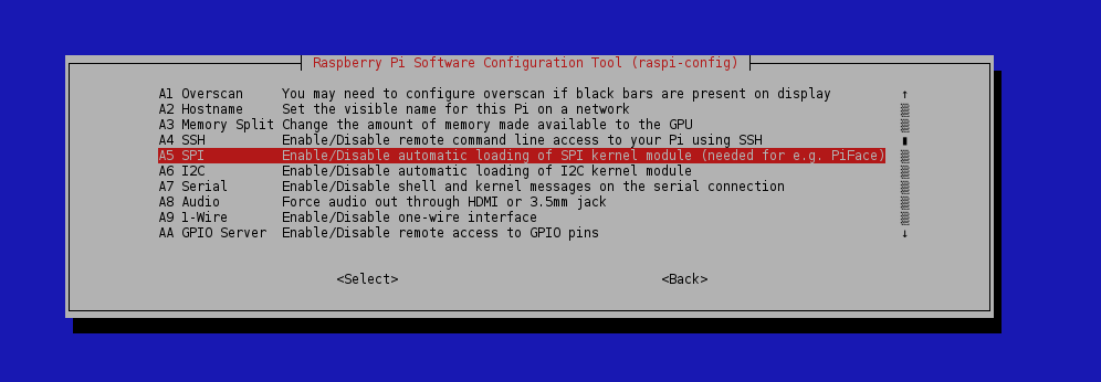 Then, you should configure Raspbian to enable SPI, which is the interface we can use to flash the BIOS. To do this, execute the command sudo raspi-config which will open a menu like this: