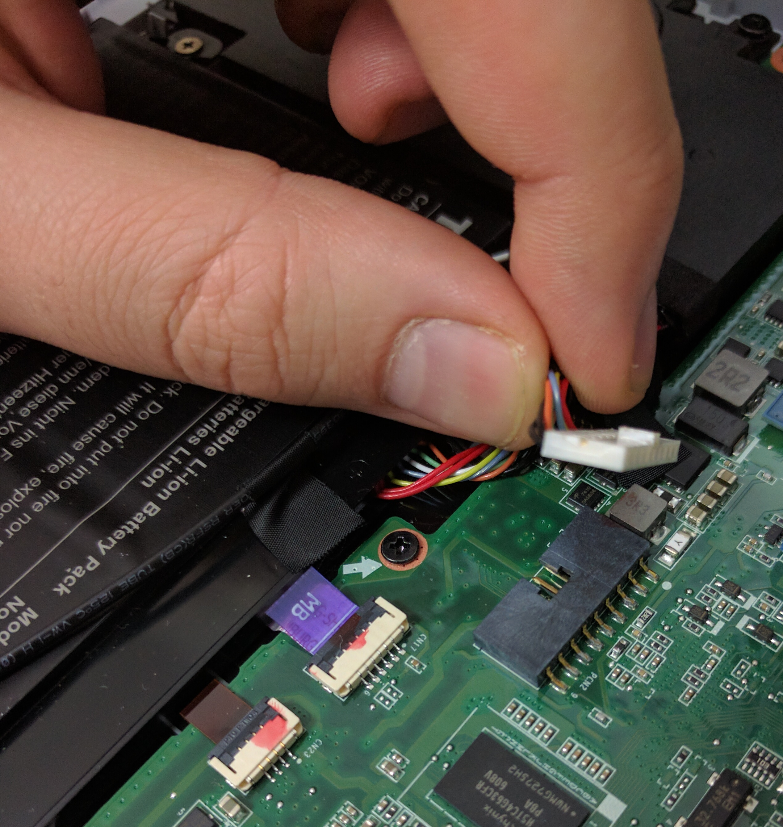 Before starting connecting anything, make sure that the battery on the notebook is disconnected, and the power cable is unplugged.